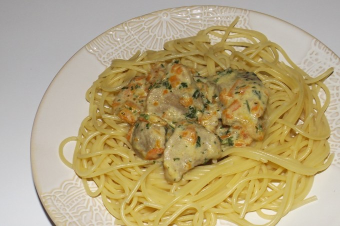 Voici un plat délicieux : du porc qui mijote longuement dans du bouillon de légumes avec des petits morceaux de carottes, de l’oignon, de l’ail et du persil et avec une touche de crème fraîche à la fin… miam !