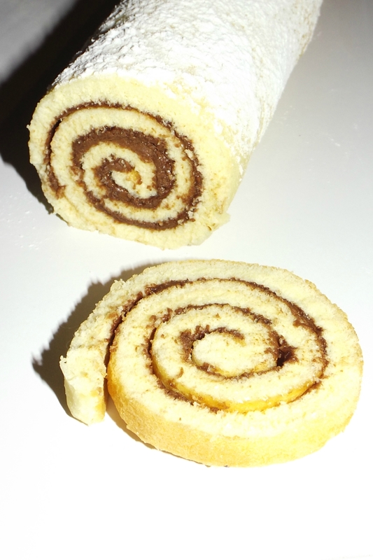 Étaler la ganache au chocolat et au nutella sur toute la surface et rouler à nouveau le biscuit en pressant légèrement.