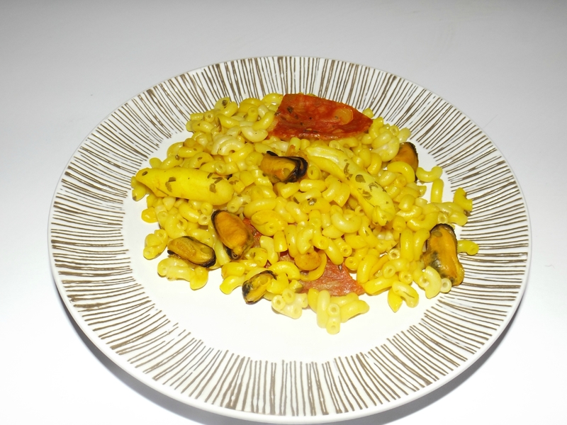 Ajouter les coquillettes égouttées, le vin blanc avec donc le safran, le concentré de tomates, du sel et du poivre.