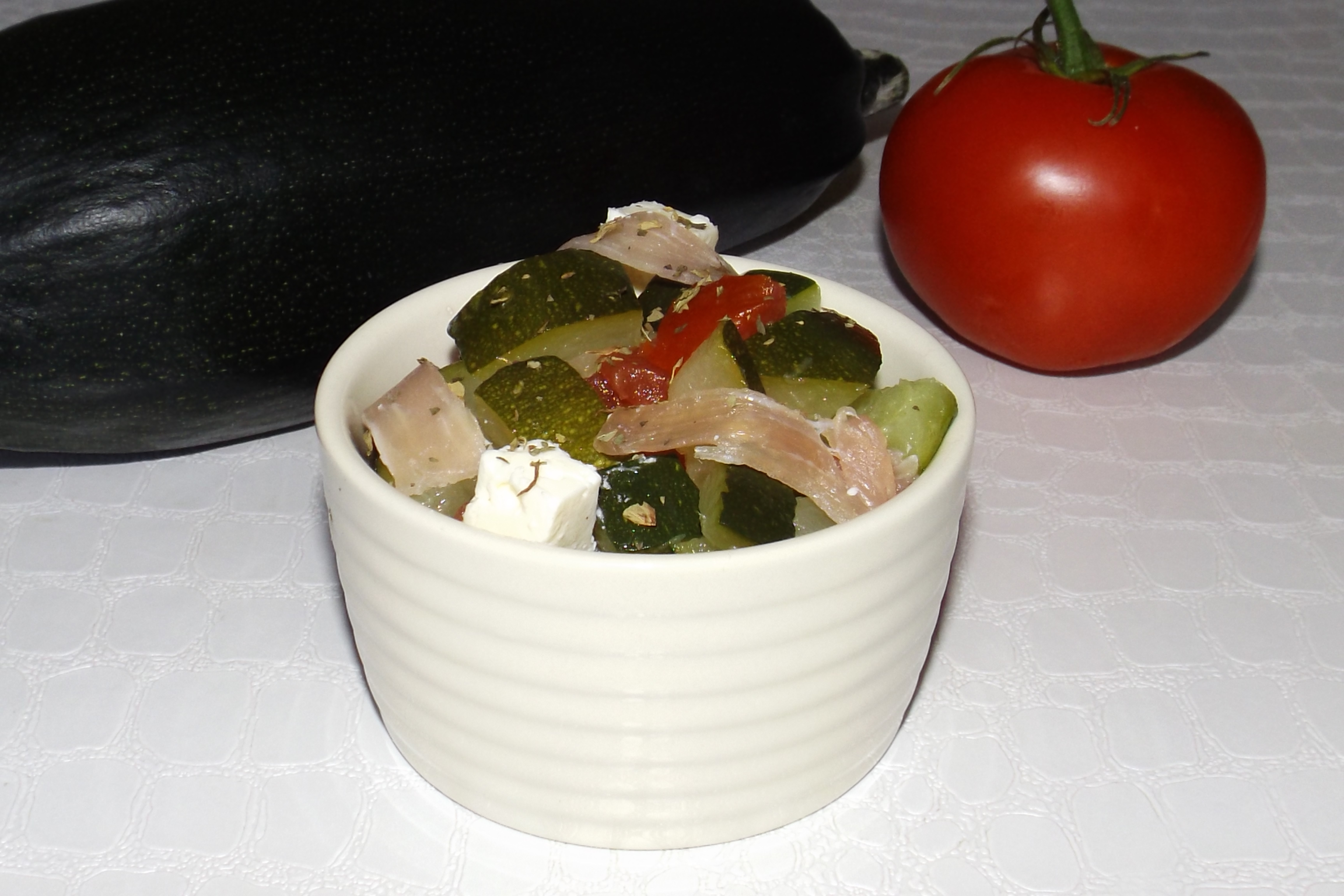 Ajouter les courgettes, le jambon cru, les tomates, la feta et les olives noires dans le saladier.