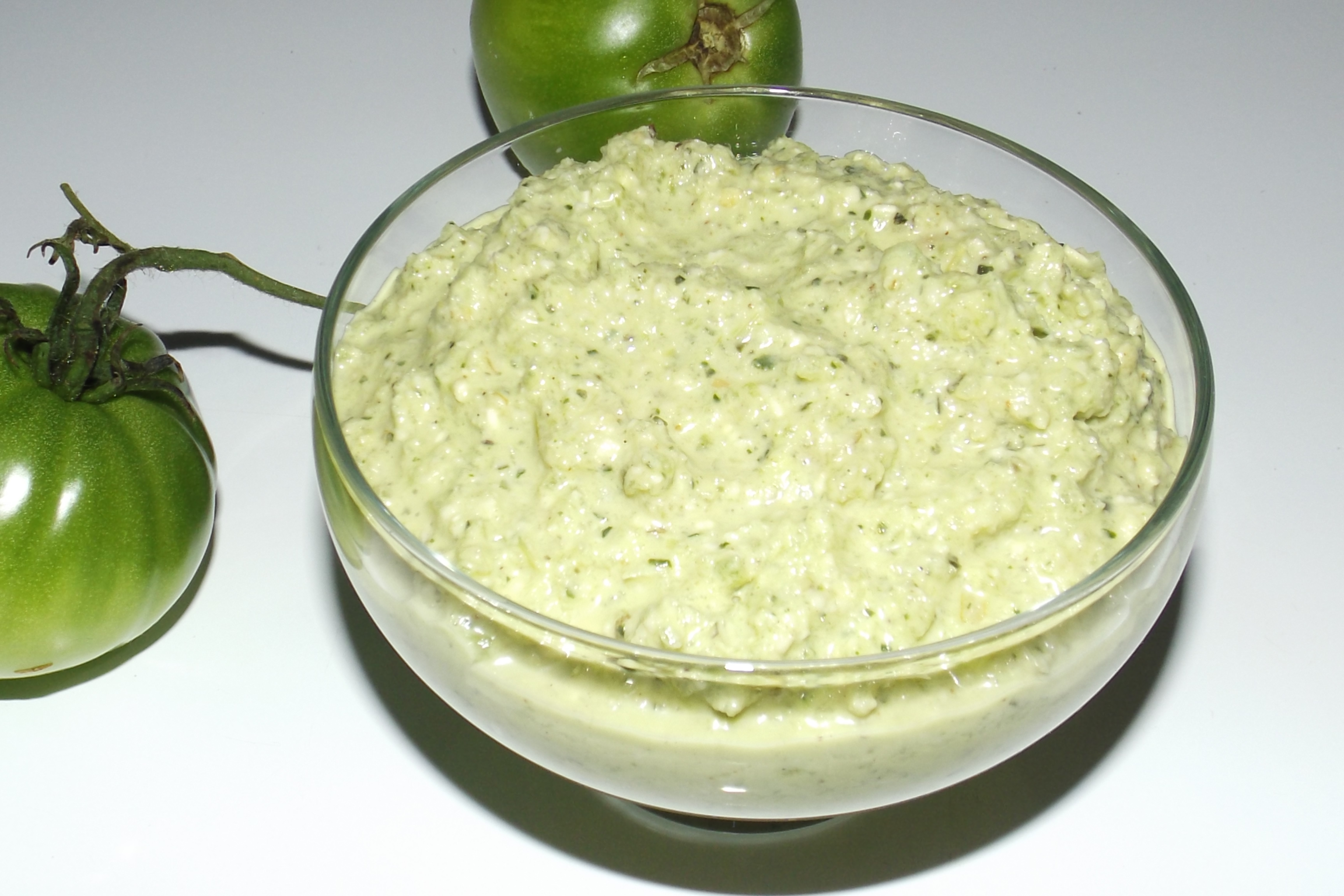 Mettre les tomates vertes, les pignons de pin, le parmesan, la sauce pimentée, le basilic, l’origan et l’ail en poudre et mixer le tout.